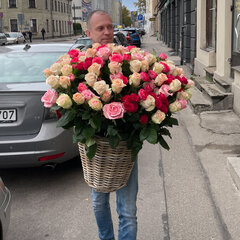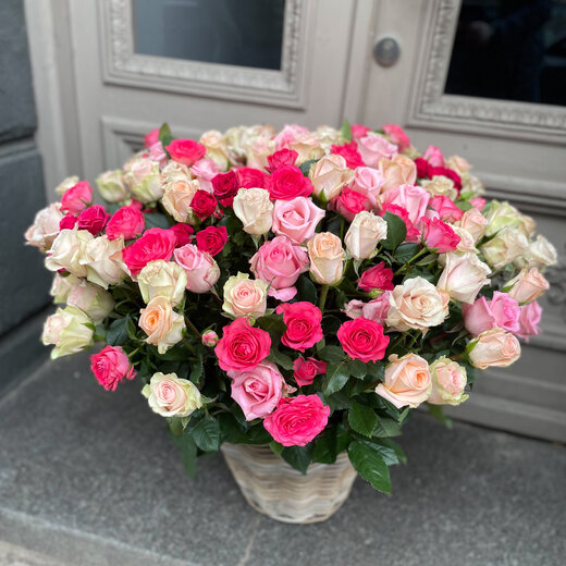 101 dažādu krāsu roze grozā, dominējošā krāsa rozā. Attēlam ir ilustratīva nozīme, groza izskats var nedaudz mainīties ja kāda no rožu šķirnēm pasūtījuma brīdī nav pieejama.