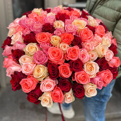 Rožu pušķis no 101 dažādu krāsu rozēm. Burvīga dāvana, kas neatstās vienaldzīgu.