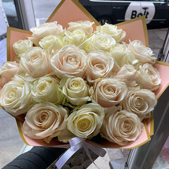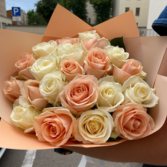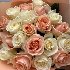 Baltu un persiku krāsas rožu mix dekoratīvā iepakojumā. pušķī iespējams mainīt ziedu skaitu, minimālais pušķa izmērs 11 ziedi.