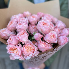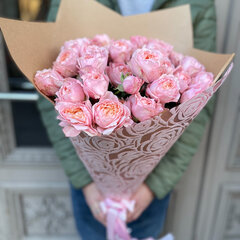 Pušķis veidots no 9 ekskluzīvas šķirnes Džuljeta peonijveidīgām krūmrozēm dekoratīvā iepakojumā.