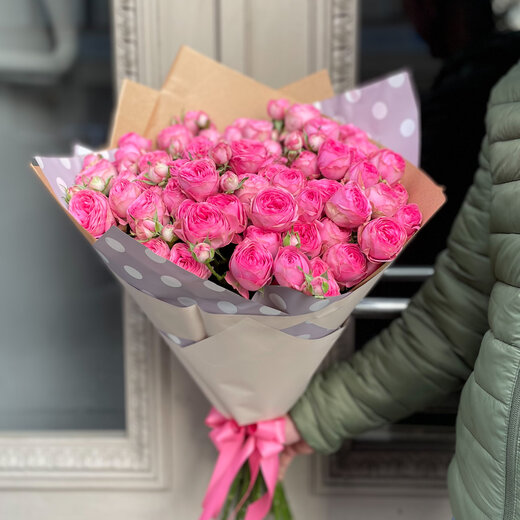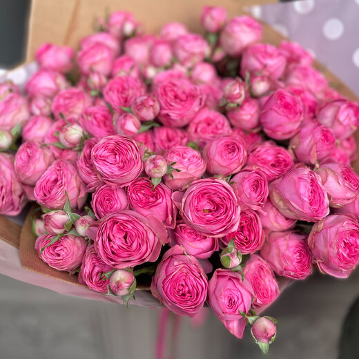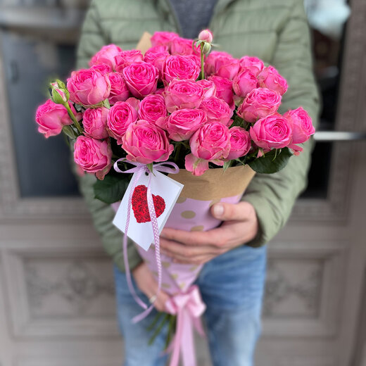 Pušķis veidots no 9 ekskluzīvām peonijveidīgām krūmrozēm dekoratīvā iepakojumā.