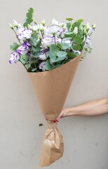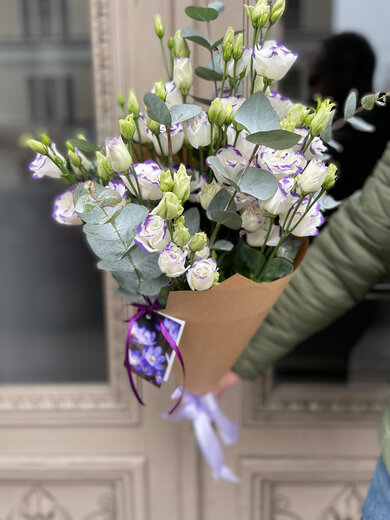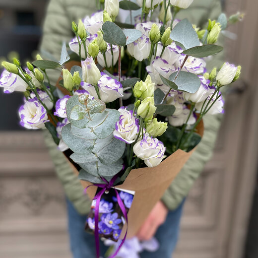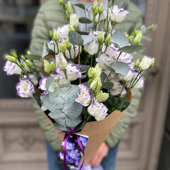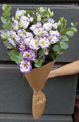 Lizanšu pušķis ar eikaliptu dekoratīvā iepakojumā. Attēlā redzamajā pušķī ir 7 lizantes, 3 zari(0,5 bunte) eikalipta, dāvanu papīrs krafts, satīna lenta. Izvēlieties sev vēlamo ziedu skaitu!
