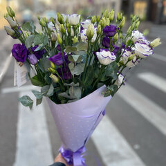 Skaists lizanšu pušķis violeti baltās krāsās ar eikaliptu, dekoratīvā iepakojumā.