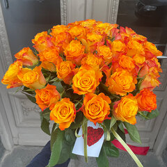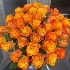 Oranžu rožu pušķis. Pušķī iespējams mainīt ziedu skaitu un ziedu garumu no 40cm - 70cm. Izvēlieties nepieciešamo rožu skaitu, mēs izveidosim pušķi un piegādāsim izvēlētajam adresātam. Minimālais rožu skaits pušķī - 11 ziedi. Ziedu izcelsmes valsts Nīderlande.