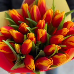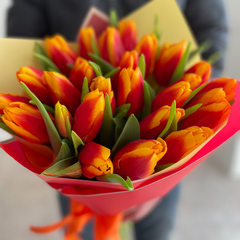 Oranžu tulpju pušķis. Pušķī 21 tulpes. Ziedu pušķa sastāvs un izskats var nedaudz mainīties, ja kāda no attēlā redzamajām ziedu šķirnēm attiecīgajā gada laikā(sezonā) nav pieejama, tā tiks aizstāta ar līdzvērtīgu. Ziedu pušķa dizaina galvenās vadlīnijas tiks saglabātas, gan pēc izskata, gan vērtības.
