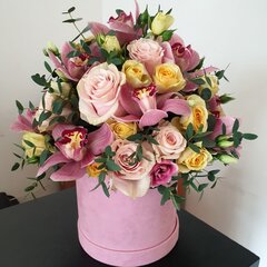 Skaista ziedu kompozīcija no rozēm, orhidejām un lizantēm samta kastē.