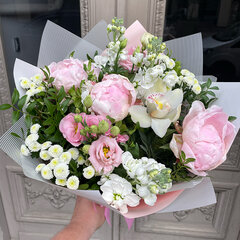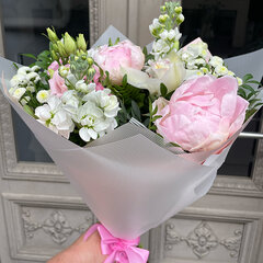 Smaržīgs peoniju un vasaras ziedu pušķis gaišās krāsās — ideāls svinīgam notikumam vai īpašam mirklim.