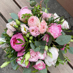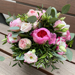 Eleganta, neliela izmēra ziedu kastīte no peoniju ziediem, peonijveida krūmrozēm un lizantēm.