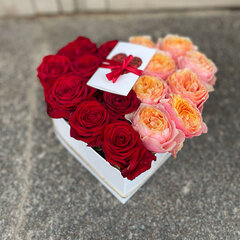 Peonijveida rozes un sarkanas rozes sirds formas kastītē. Kastīte sastāv no 15-17 rozēm, atkarībā no ziedu galvu izmēra un rožu šķirnes.