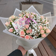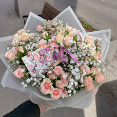 Ziedu pušķis no krūmrozēm un gipsofīlas (plīvurpuķe), maiga un gaisīga ziedu kompozīcija dekoratīvajā iepakojumā.