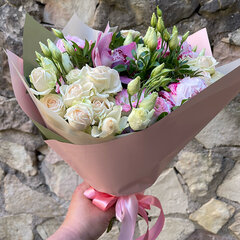 Ziedu pušķis kas veidots no peonijām, krūmrozēm, lizantēm, orhidejas zieda, pistācijas zariem.