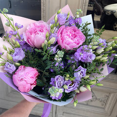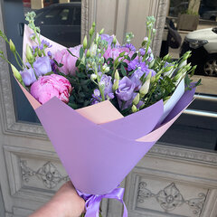 Vasarīgs un burvīgi smaržojošs ziedu pušķis no peonijām, lizantēm, lefkojām un pistācijas zariem.