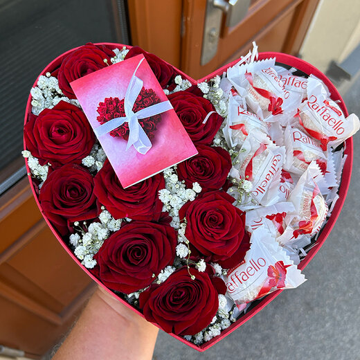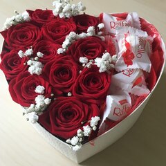 Rozes sirds formas kastē, kompozīcija papildināta ar Raffaello konfektēm. Kompozīcija sastāv no 11 sarkanām rozēm un 150 g. Rafaello konfektēm.