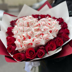 Šī īpašā dizaina ziedu kompozīcijas sastāvs: 21 gab. 50 cm. garām sarkanas rozes, 500 gr. Raffaello knfektes, dažādi floristikas materiāli, dekoratīvais iepakojums, satīna lenta, komplektā ietilpsts bezmaksas apsveikuma kartīte.