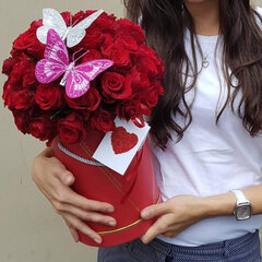 Burvīga sarkanu rožu kompozīcija apaļas formas dāvanu kastē ar tauriņiem - dekoriem. Ja vēlaties pārsteigt, šī ir pareizā izvēle. Kompozīcija veidota no ~41 rozes, atkarībā no ziedu galvas izmēra rožu skaits var nedaudz mainīties.