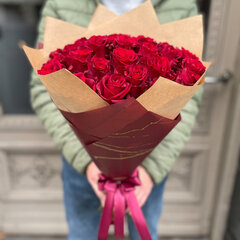 Ekvadorā audzētu, augstākās kvalitātes sarkanu 50 cm garu rožu pušķis dekoratīvā papīrā.
