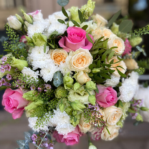 Neliels sezonas ziedu pušķis. Attēls ir ilustratīvs, pušķa sastāvs var mainīties atkarībā no attiecīgajā sezonā, gada laikā pieejamiem ziediem, krāsu gamma un vērtība tiek saglabāta.