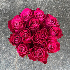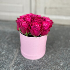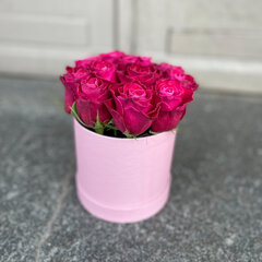 Tumši rozā rozes apaļā kastītē. Ziedu skaitas kastītē 11 rozes, atkarībā no ziedu galvu izmēra.