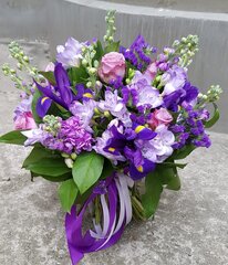 Īrisu, frēziju un lefkoju ziedu pušķis ar zaļumiem, ziedu pušķis veidots no 19 dažādiem ziediem