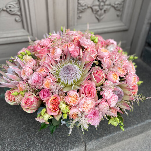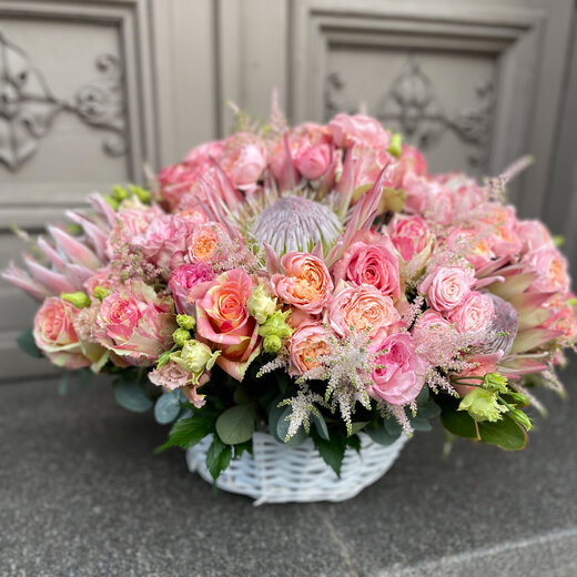 Rozā ziedu grozs. Attēlam ir ilustratīva nozīme, ziedu sastāvs grozā var mainīties, ziedu krāsas un ziedu groza vērtība tiek saglabāta. Grozam pieejami divi izmēri Standart un Premium, premium grozs būs par 1/3 lielāks.