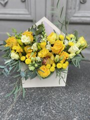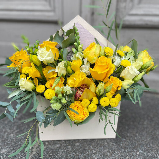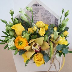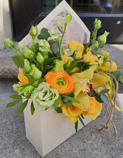 Ziedu kompozīcija aploksnes formas kastē, kompozīcijas pamatā dzeltenas krāsas ziedi- rozes, lizantes, ranunkuļi un cimbīdija, zaļumi- eikalipta zariņi.