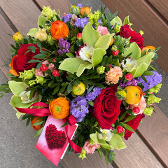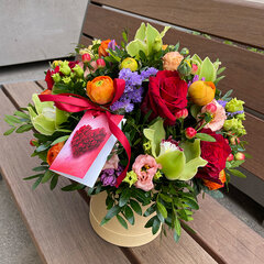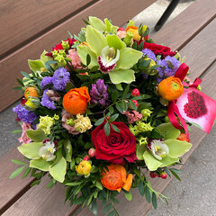 Attēlam ir informatīva nozīme, ziedu kastītes sastāvs, krāsas un ziedu proporcijas var mainīties atkarībā no ziedu šķirņu pieejamības attiecīgajā gada laikā (sezonā).