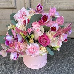 Romantiska ziedu kompozīcija kastītē, veidota no rozēm, orhidejām, lizantēm, eikalipta un citiem ziediem.