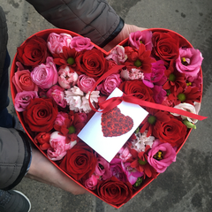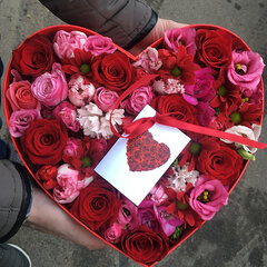 Ziedu kompozīcija sirds formas kastītē, īpaši piemērota dāvināšanai Valentīndienā. Ziedi ievietoti samitrinātā oāzē, ērti pārvadāt, viegla ziedu kopšana.
