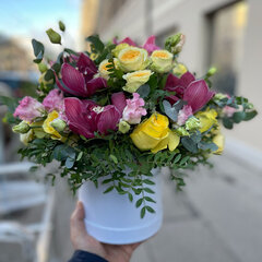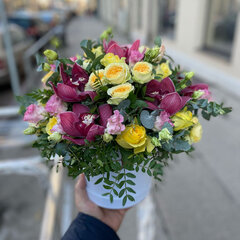 Ziedu kompozīcijas sastāvs: 5 orhideju ziedi, 5 rozes, 3 lizantes, 3 krūmrozes, 0.3 eikalipts, 0.3 dažādi dekoratīvie augi, ziedu kastīte, 0.5 oāze, floristikas materiāli un bezmaksas apsveikuma kartīte.
