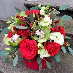 Dažadu ziedu kopozīcija sarkanā samta kastē. Ziedu kopozīcijas sastāvā rozes, cimbīdija (orjideja), lizantes un dekoratīvās odziņas.