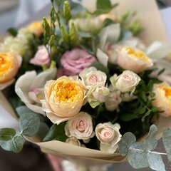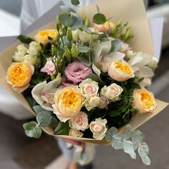 Ziedu puskis ar peonijveida rozēm, lizantēm, orhideju ziediem, krūmrozēm un eikaliptu. Ziedu kompozīcija sastāv no 15 ziediem un zaļumiem. Dažādos gadalaikos ziedu pušķa izskats var nedaudz mainīties.