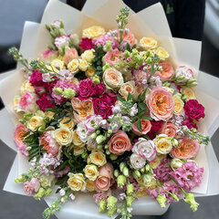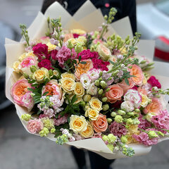 Košs ziedu pušķis, kas sastāv no 25 dažādiem ziediem, rozes, krūmu rozes, lizantes, lefkojas vai citiem sezonas ziediem. Lieliska krāsu gamma un ziedu kompozīcija. Attēlam ir informatīva nozīme, pušķa sastāvs var nedaudz mainīties atkarībā no pieejamajām ziedu šķirnēm.
