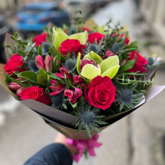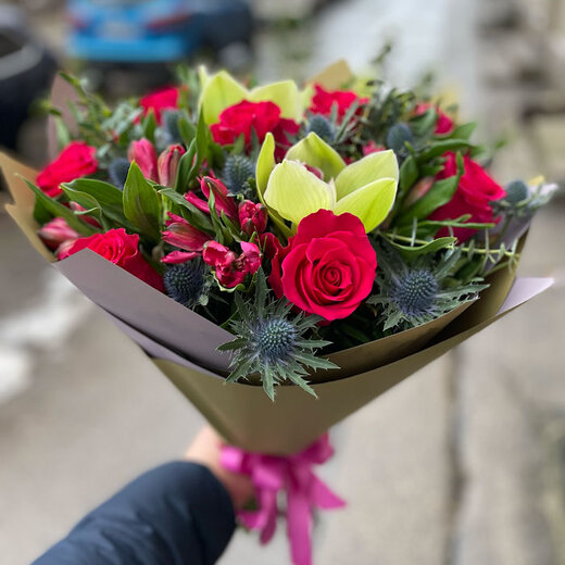 Kompozīcija sastāv no: 9 rozēm, 5 alstromērijām, 3 orhideju ziediem, 5 eryngium, 0.5 eikalipts, dekoratīvais iepakojums, bezmaksas apsveikuma kartīte.