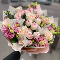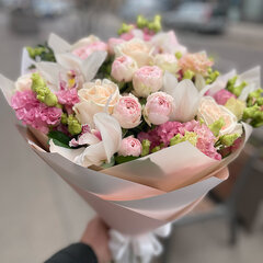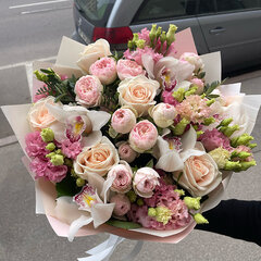 Pušķa sastāvs: 3 peonijveida krūmrozes, 3 lizantes, 5 rozes, 3 orhideju ziedi, dekoratīvais iepakojums, satīna lenta, bezmaksas apsveikuma kartīte.