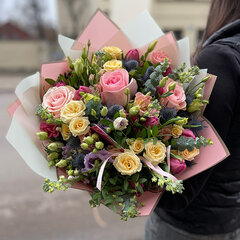 Pušķa sastāvs: 5 rozes, 5 tulpes, 3 lizantes, 3 krūmrozes, 5 lefkojas, 5 eryngium, 0.3 eikalipts, dekoratīvais iepakojums, satīna lenta, bezmaksas apsveikuma kartīte.