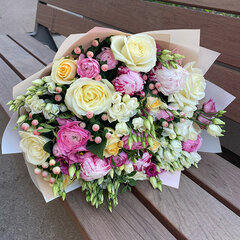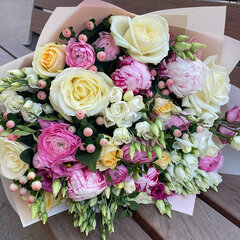 Liela izmēra ziedu pušķis no dažādiem skaistiem ziedim, piemērots romantiskiem mirkļiem un citiem īpašiem notikumiem.