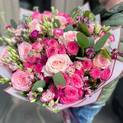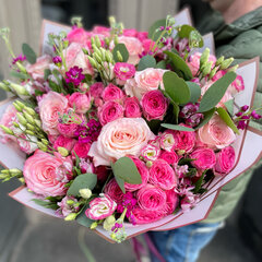 Ziedu pušķis Spilgtais veidots no rozēm, krūmrozēm, lizantēm un citiem ziediem, zaļumiem. Pušķī ir ~ 25 ziedi, iepakots dekoratīvā papīrā. Premium pušķī ~33 ziedi.